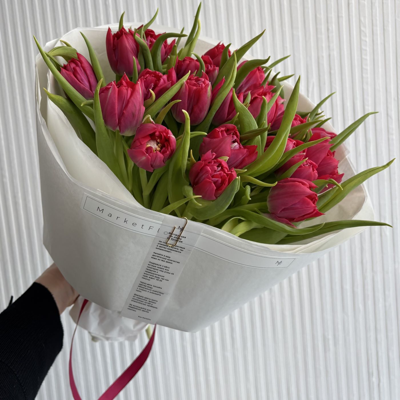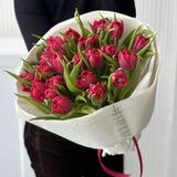 Пионовидные тюльпаны в упаковке из тишью и маттовой пленки.